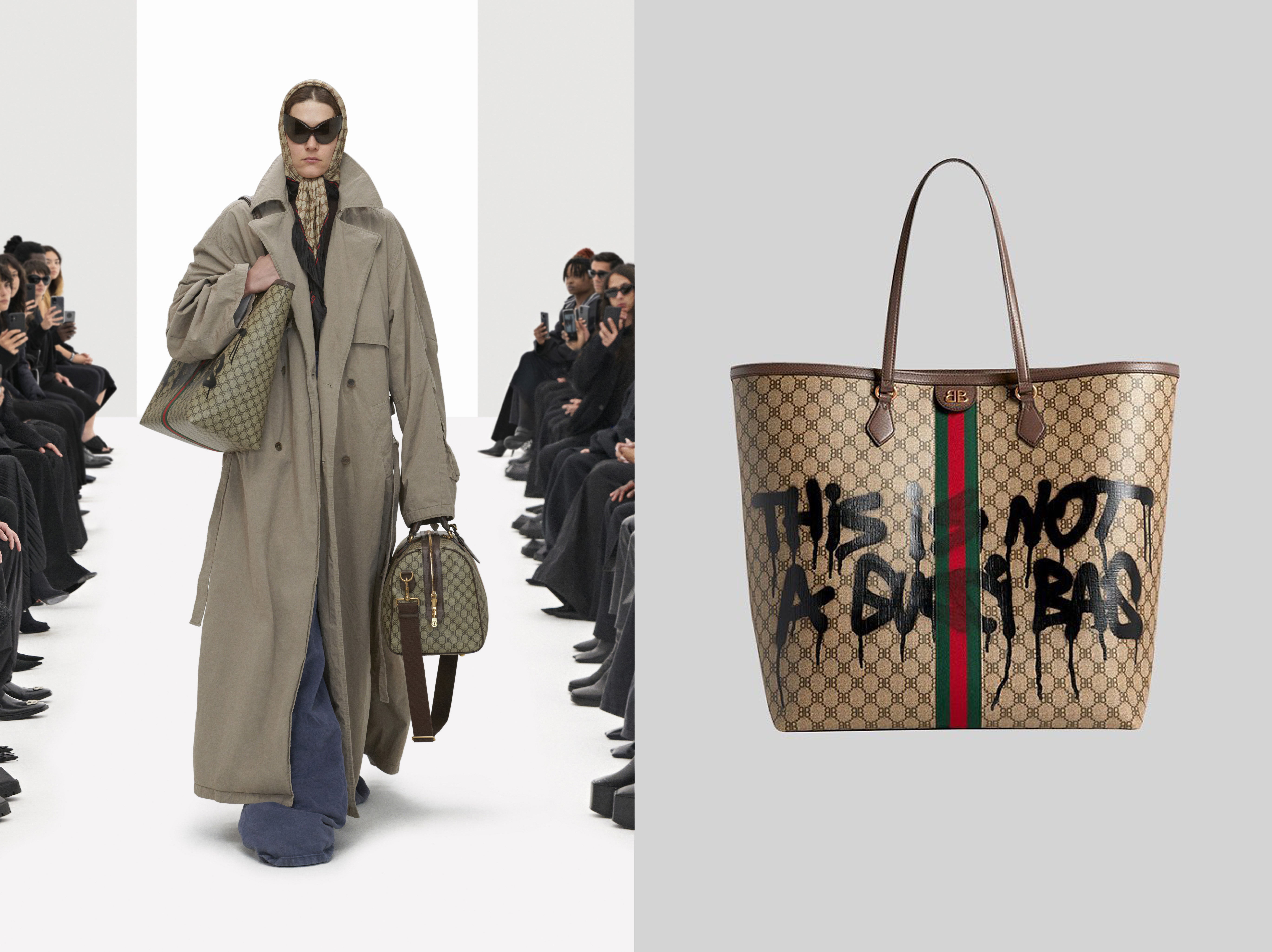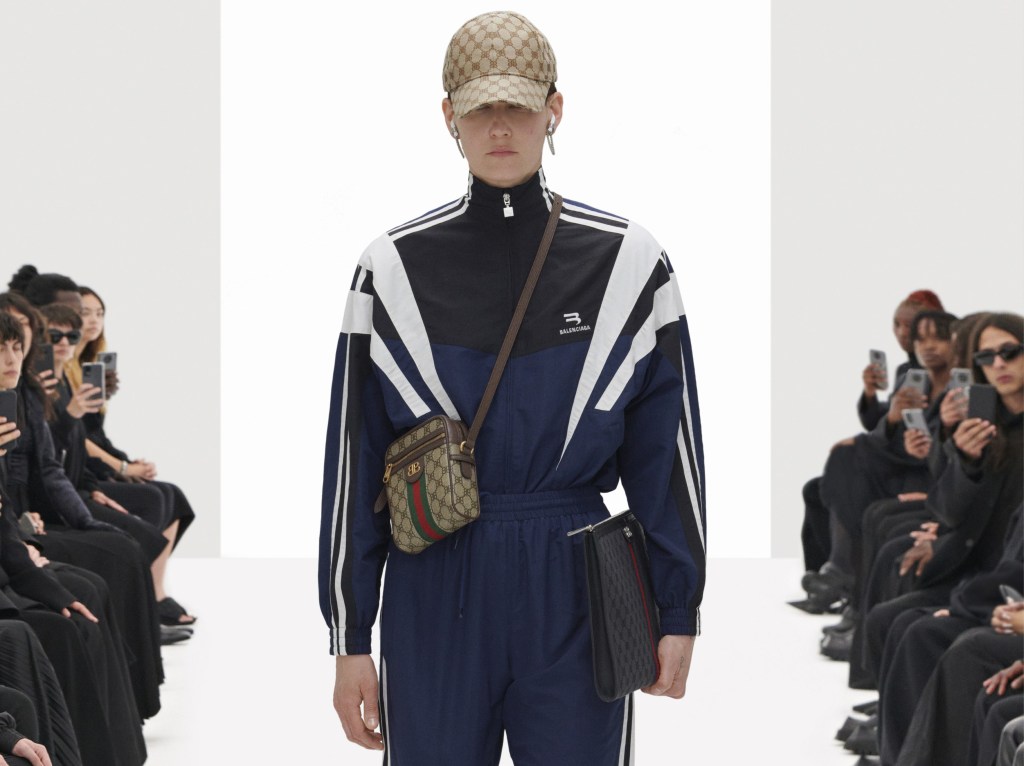 Also in this collection the mix of the aesthetic codes of the two brands returns, but this time the focal point is authenticity, counterfeiting, the appropriation of identity within the fashion system. The result of the hacking is highlighted above all on the accessories: bags, scarves and hats that replace the Gucci logo with the Balenciaga one.