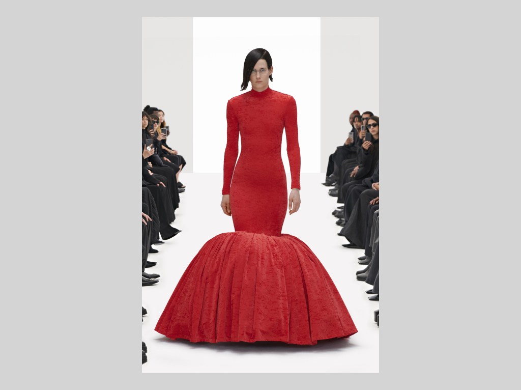 Gli abiti da sera diventano pant-suit decorati da corsetti, il tailleur pantalone in versione tuta per la sera, i dress con le spalle strutturate, drappeggiati e plissettati. I cargo pants si trasformano in pantaloni da rave party, in stile cyber goth, ritornano le iconiche stampe floreali ma anche nuove grafiche irriverenti. Impresso su molti capi il tag “Bébé“, ossia bambino, che riproduce il suono con cui i francesi pronunciano le due B del logo di Balenciaga, le scarpe e i boots riproducono la forma delle dita, le clog in gomma di Crocs si trasformano in stivali da pioggia dalle tinte acide e mule con tacco.