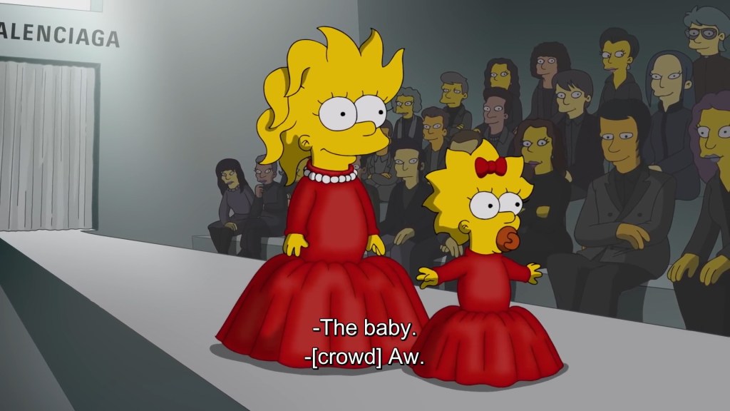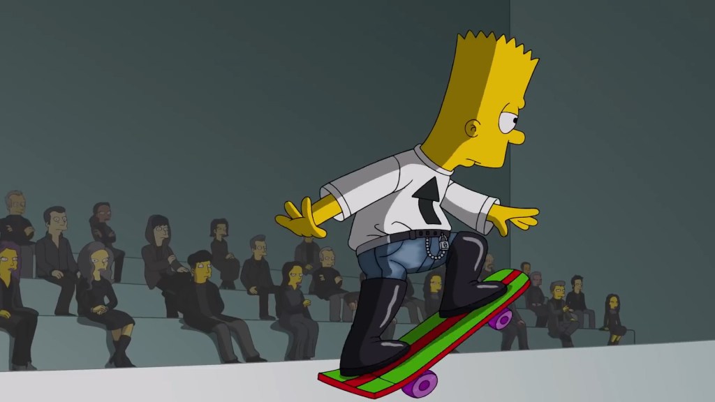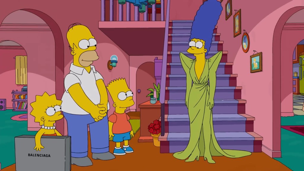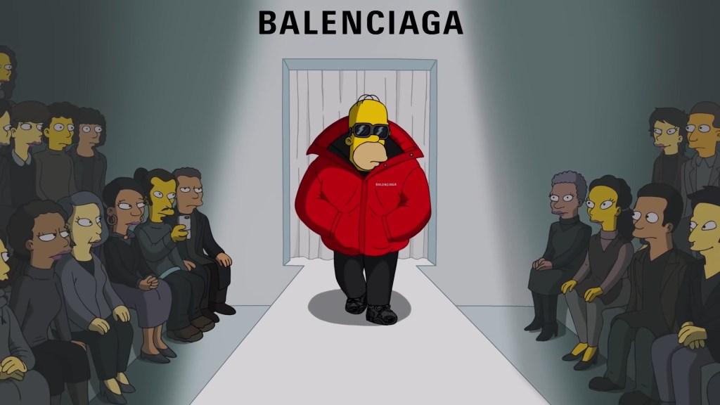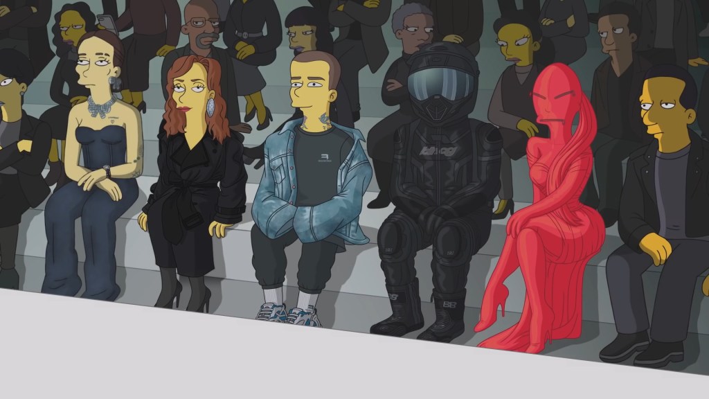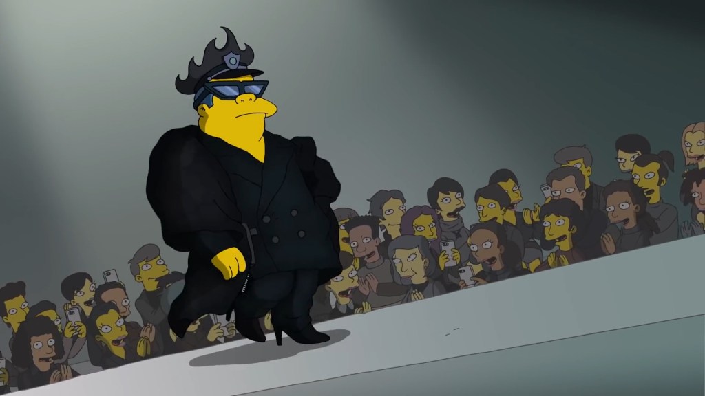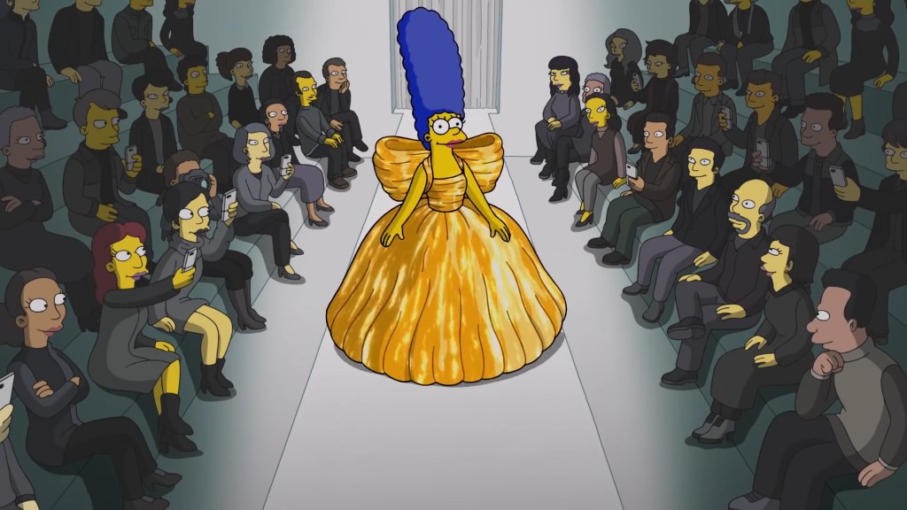 Homer Simpson ha indossato l’iconico parka rosso oversized, mentre il burbero barista Moe ha vestito un cappotto color cammello dalle spalle oversize, Bart una maglietta a maniche corte con stivali in pelle e la mamma Marge un meraviglioso vestito color oro.