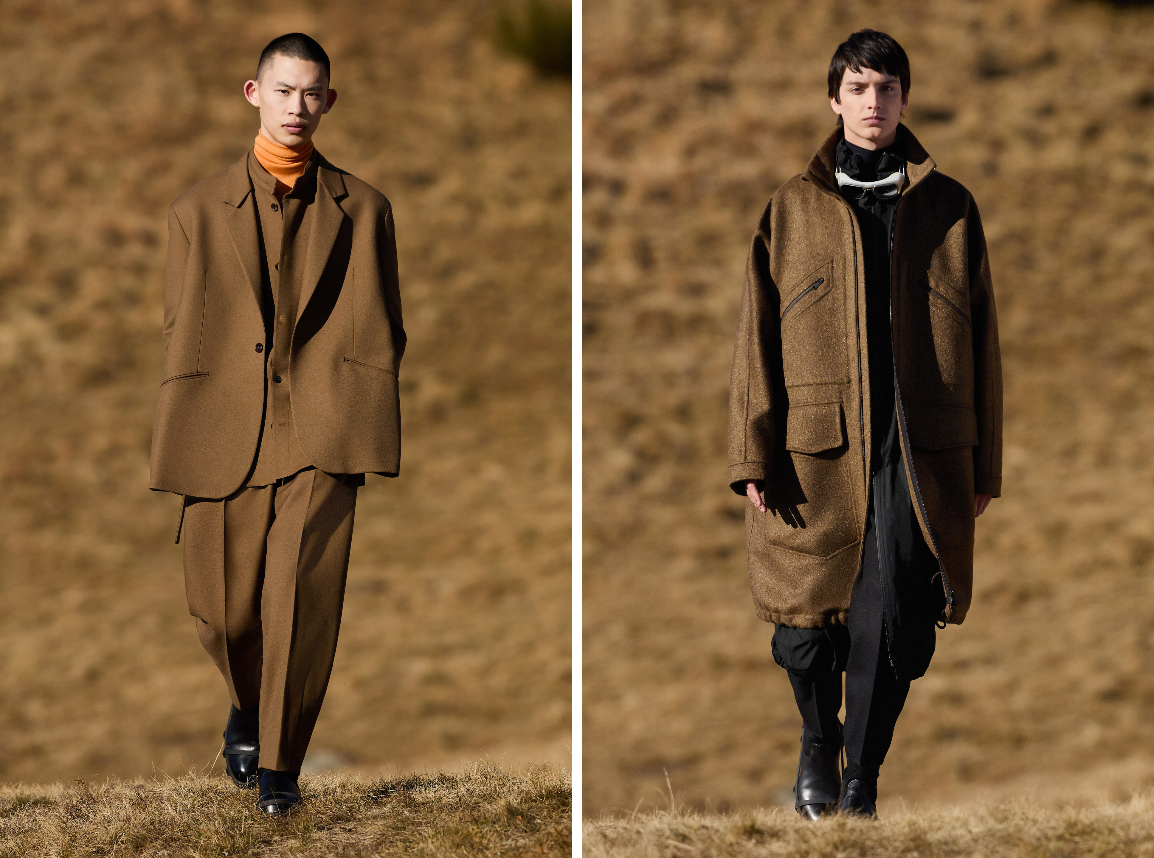 Ermenegildo Zegna opened the calendar of the Camera Nazionale della Moda Italiana on Friday 14 January. The Zegna man is one with real time and with the present. He dresses with ideas and colors, chasing the neutral and calm tones of cream and rope, throwing himself into dark browns, blues and burnt ones. Light shapes, but which are combined with mountain silhouettes; visible technical details, double breast pockets and invisible zips that replace buttons. Alessandro Sartori transports us, with this collection, to a space-time without compromise and without ‘business’ labels.