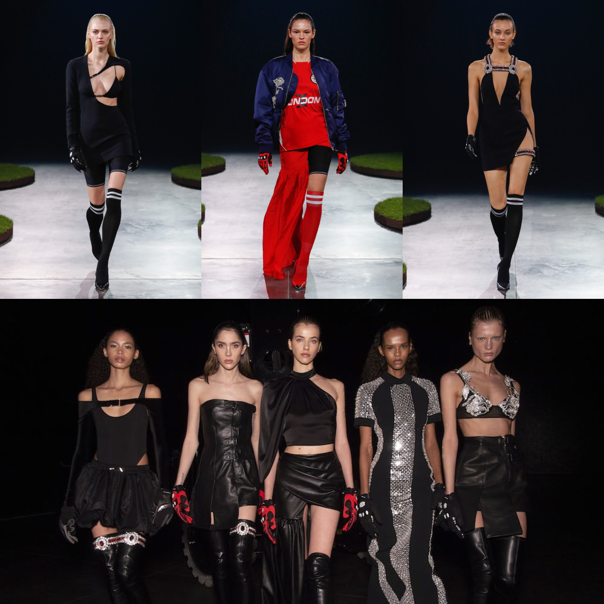 High-leg bodysuits and jeweled garters for David Koma, a lot of glitter and glamor in a sporty version.