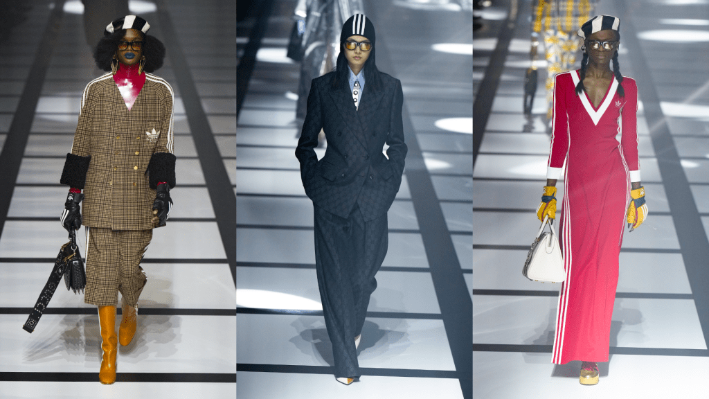 Da Gucci impera il massimalismo, le modelle sfilano davanti a uno specchio deformante, metafora del potere fantasmagorico della moda. La sua narrativa è riconoscibile e come sempre di successo; la collezione è dissacrante si ispira agli anni Ottanta, l’iconico logo con le tre righe di Adidas campeggia su berretti, giacche, borse e completi da sera.