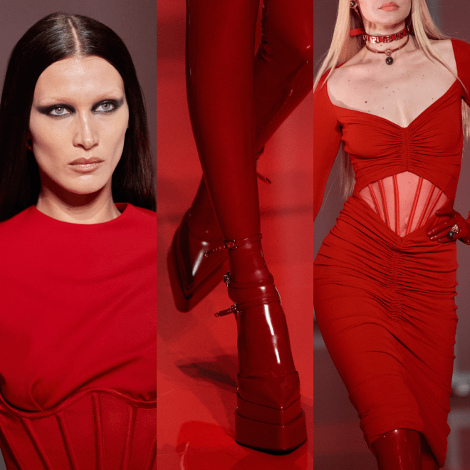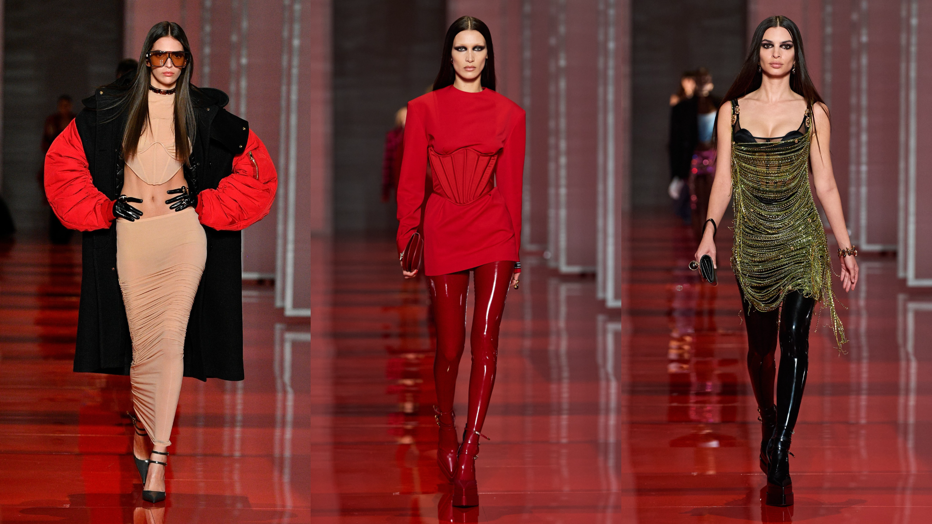 Cattivissima, sicura e sensuale la donna di Donatella Versace per l’autunno/inverno 2022/2023. L’elemento principe della collezione è il bustier di derivazione couture: abiti nude aderenti come una seconda pelle, leggings in latex e bustier rosa candy da portare sui jeans. Come sempre non è mancata la passerella finale della stilista tra le modelle tra cui le superstar Emily Ratajkowski, Precious Lee, Bella Hadid e la super model Gigi Hadid.