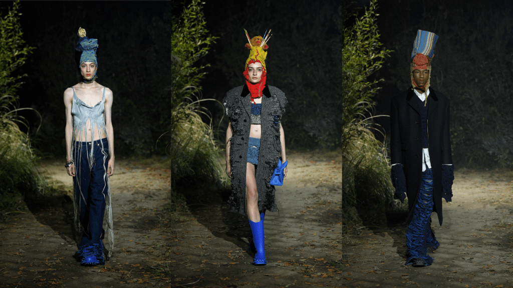 Racconta una storia del passato la collezione Autunno Inverno 2022/2023 di Marni, un mix di vecchio e di nuovo, talismani da custodire, elementi personali da condividere; oggetti della tradizione, che sembrano rammendati e rubati da un museo, abiti ampi e fluidi, pantaloni erosi, camicie strappate, maglioni fuori misura e riparate.
