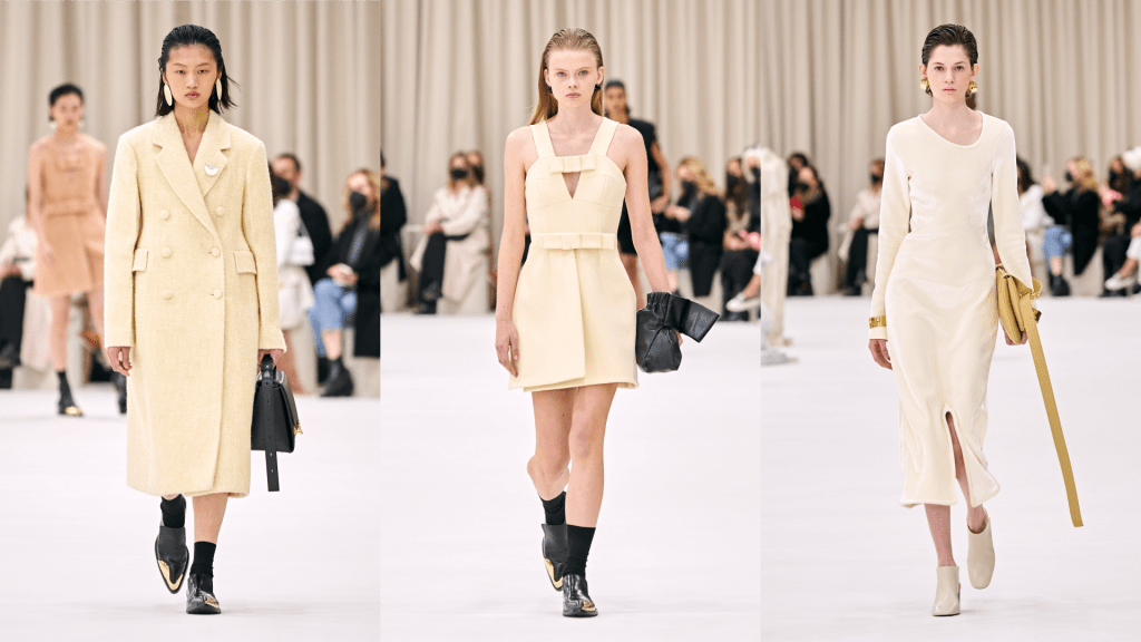 On the other hand, the Jil Sander show is surreal and minimalist, presenting his collection in an industrial space filled with copies of ancient statues, the collection designed by Lucie and Luke Meier is full of prints on quilted coats and silk dresses. A masculine and feminine mix like the lace dress to be worn with an oversized blazer, almost always worn with masculine shoes and socks or enhanced by knitted bonnets with crystals and small fringes that dance on the forehead.