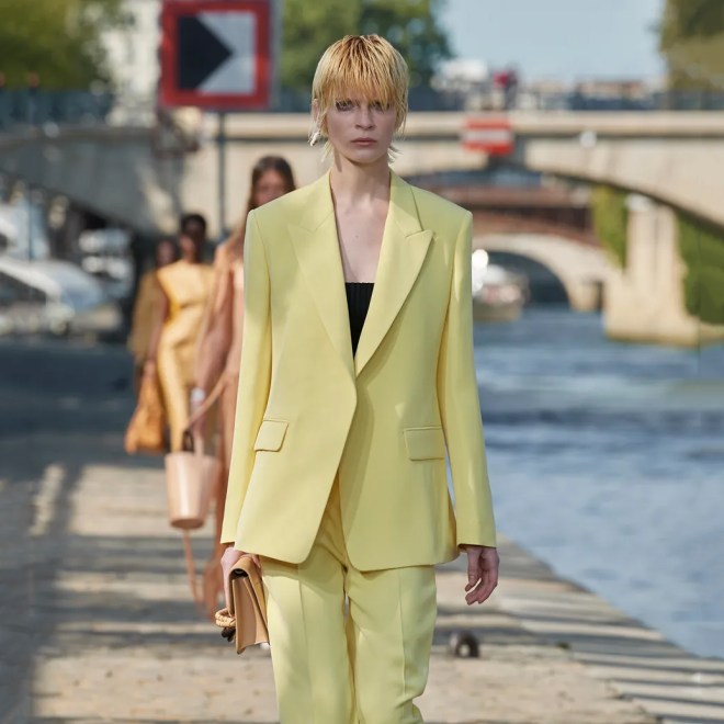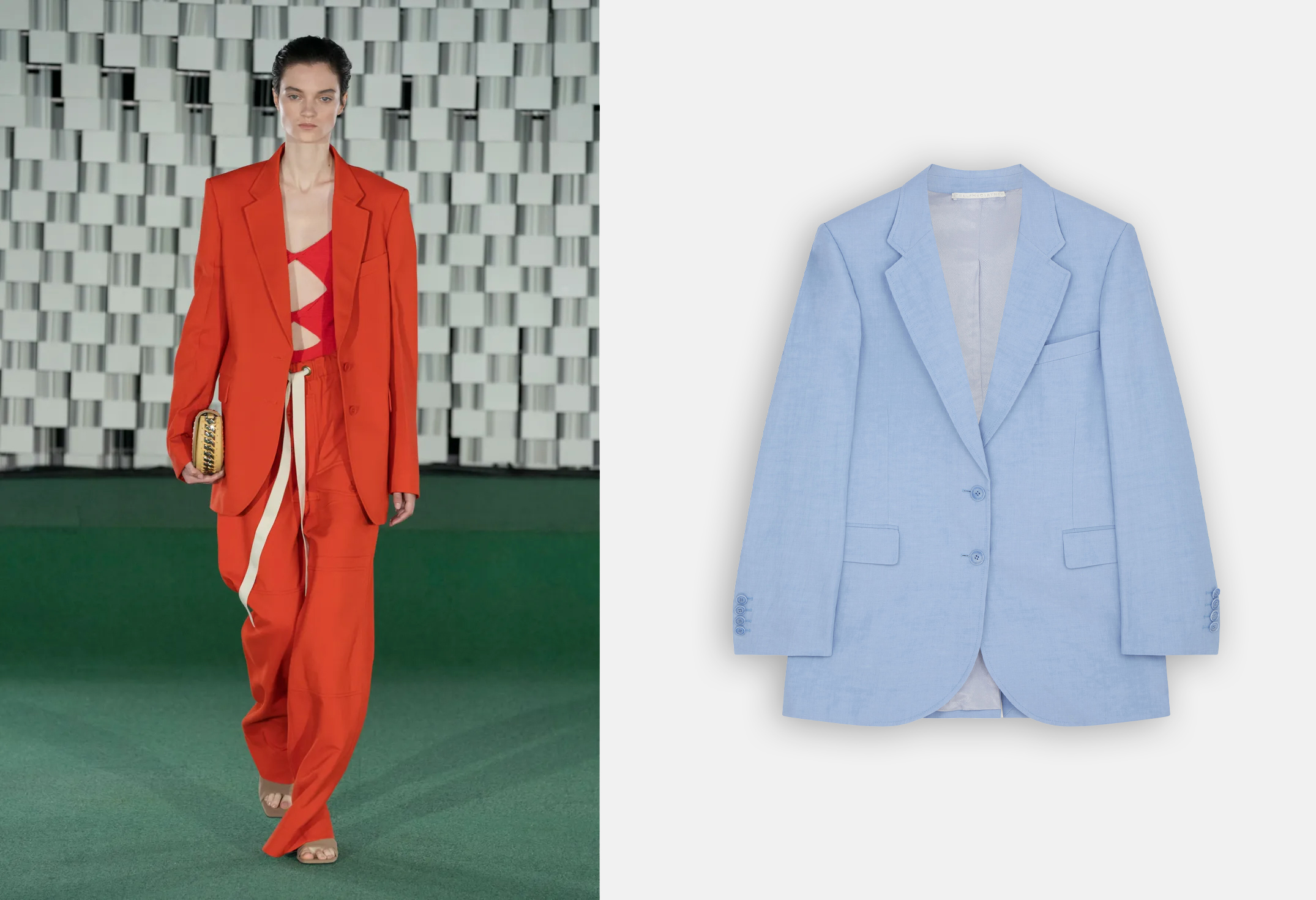 La designer Stella McCartney, propone il tailleur arancione dall’allure pop, con una giacca oversize e pantaloni a gamba ampia.
