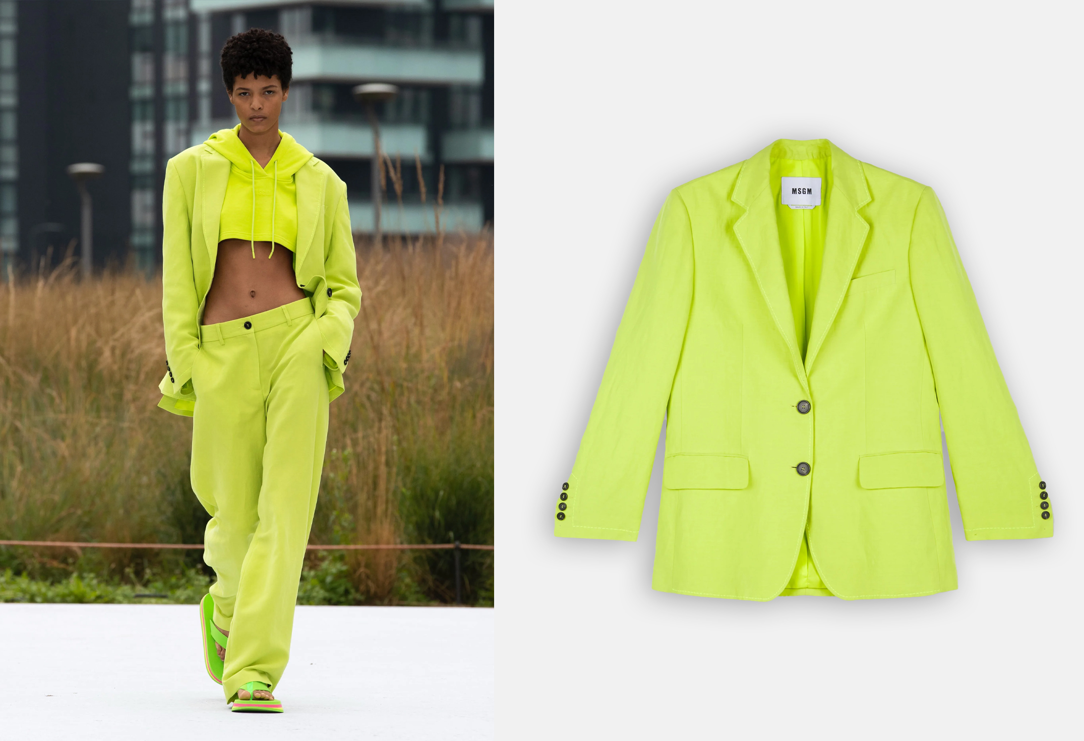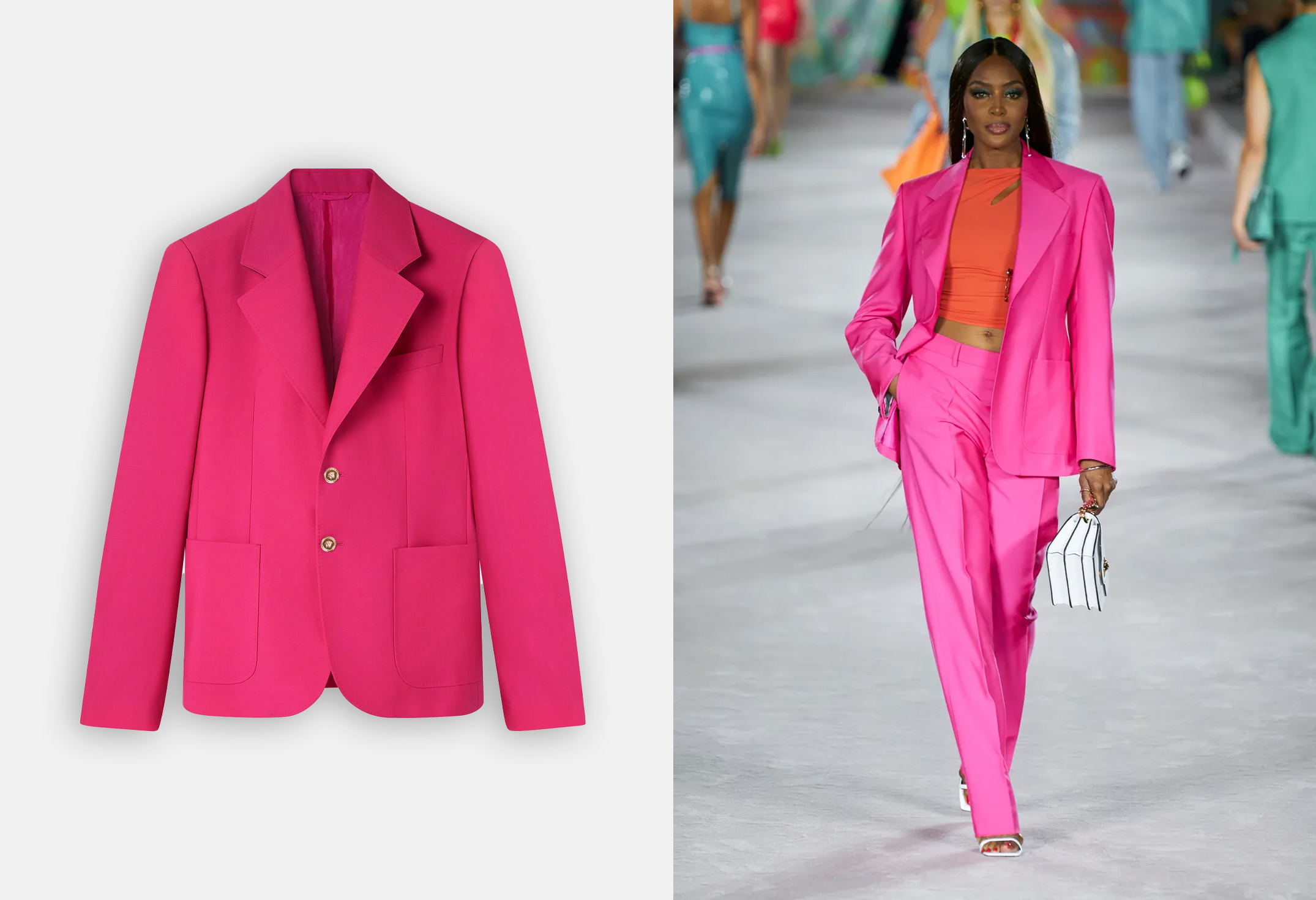 Anche Versace osa con colori pop, con blazer decorati con le iconiche spille da balia, signature della maison.