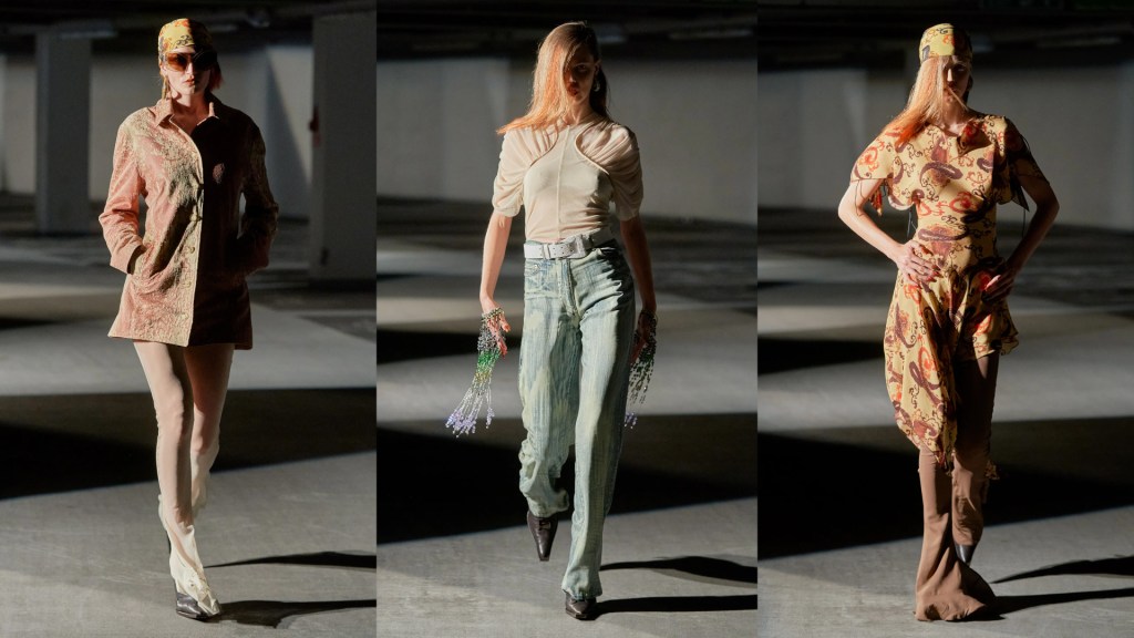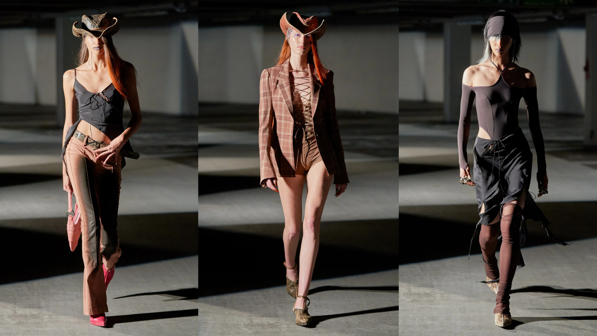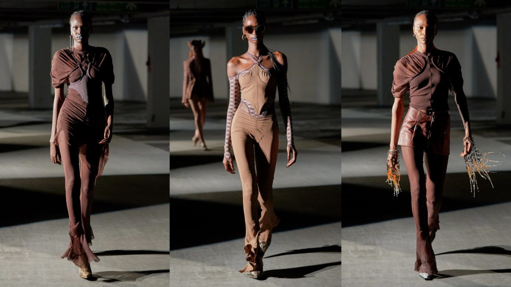 La collezione Spring Summer 22 è un tripudio di sottovesti in seta, bralette e corsetti, pantaloni con dettagli in pizzo e motivi bondage che evocano fantasie fetish.
