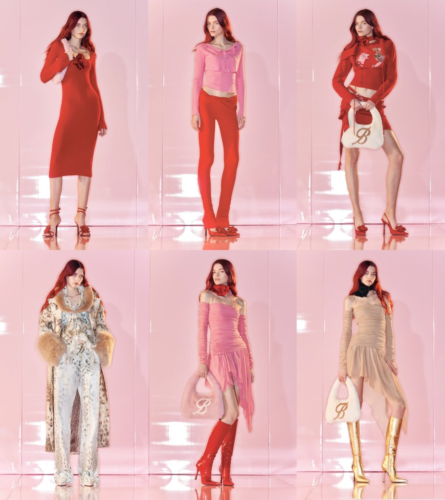 Il risultato è una collezione autunno inverno 2022 2023 che cavalca l’onda delle tendenze anni 90. Lunghezze mini, drappeggi, scolli audaci e catsuit. Il ritorno alla maglieria crop, alle cinture scintillanti ed ai colori pastello in mashup con i più cangianti metallizzati rosa, il rosso e il verde e l’insostituibile pattern animalier; gli accessori must have della stagione sono la borsa furry style e la cintura con la maxi ‘B’ gold.
