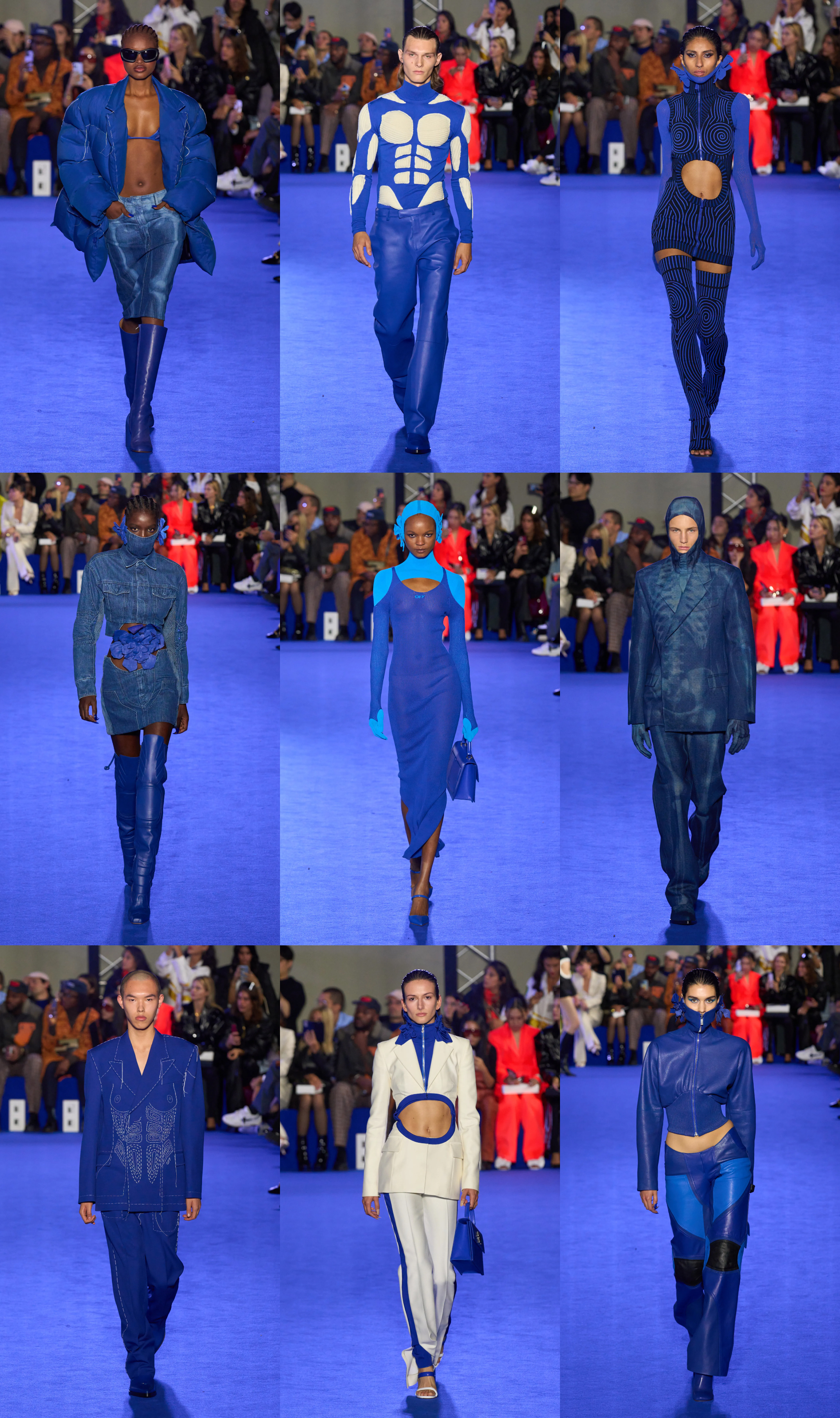 L’elemento colore è il blu, la passerella dove sfilano le modelle è cyan, la palette spazia dagli azzurri ortensia fino al bianco e al nero.