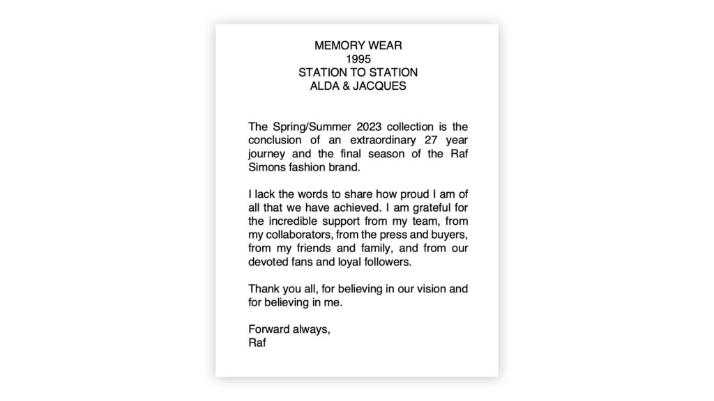 L’annuncio è arrivato tramite un post pubblicato sul suo profilo Instagram, lasciando tutti senza parole: “La collezione Primavera/Estate 2023 è la conclusione di un viaggio straordinario durato 27 anni e l’ultimo capitolo del brand Raf Simons“, si legge nel post.