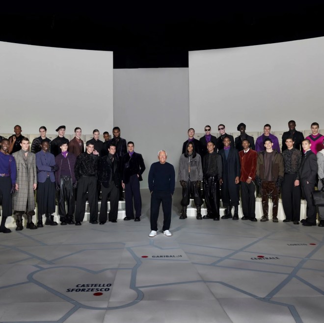 The Armani show comes to life in Via Bergognone under the banner of timeless sophisticated elegance, on the notes of a dreamy sound inspired by Ludovico Einaudi, among nuances King George loved grey, dove grey, black, red and midnight blue.