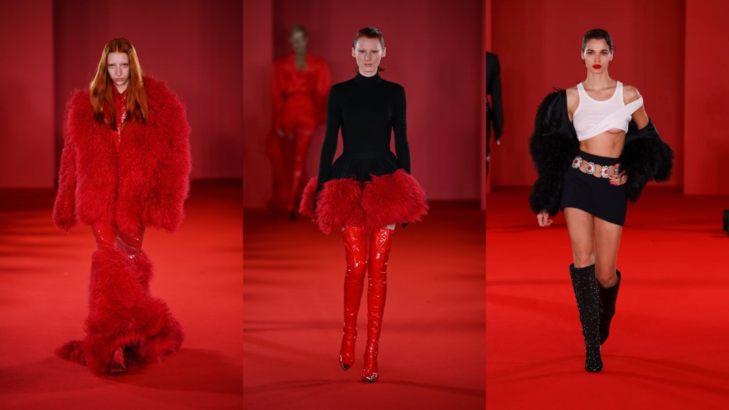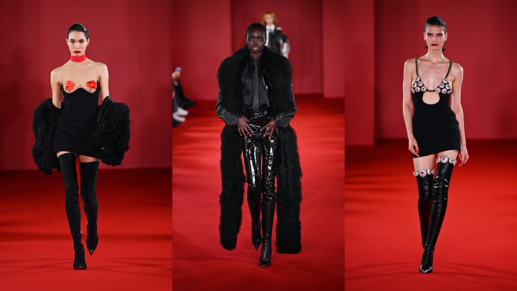 La collezione FW 23/24 di David Koma ruota intorno al concetto di glamour, un omaggio alla leggendaria attrice tedesco-americana Marlene Dietrich, musa ispiratrice di una estetica femminile e raffinata. Koma gioca sulle asimmetrie di top, abiti e gonne; protagonisti anche capi intricati con fiori in pelle verniciata, tagliati a mano e collegati insieme ad anelli, l’approccio couture si unisce al prêt-à-porter.