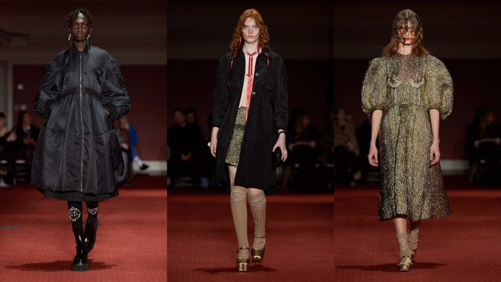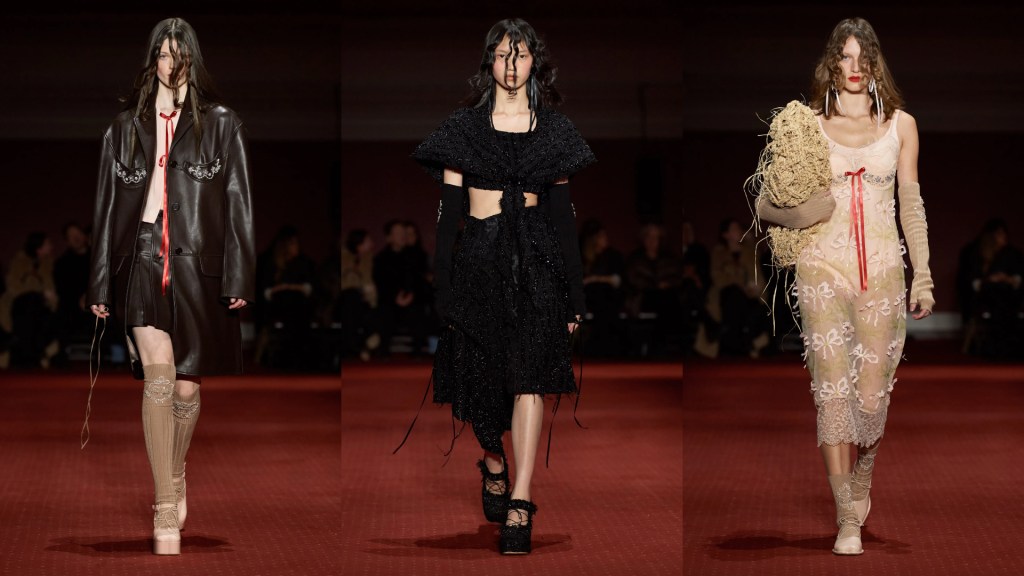 Simone Rocha celebra la festa gaelica del raccolto, chiamata “Lughnasadh” che ricorre ogni primo di agosto, tra rose e fiocchi adagiati sotto agli occhi come se fossero lacrime, pizzi, ricami, cristalli e perle. Rafia per accessori e abiti, il grano diventa quasi il materiale della collezione, un mix di texture e materiali diversi.