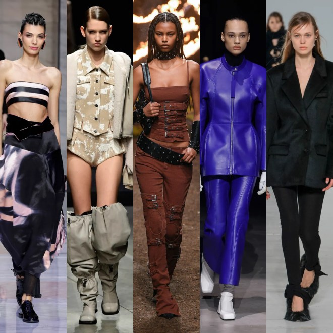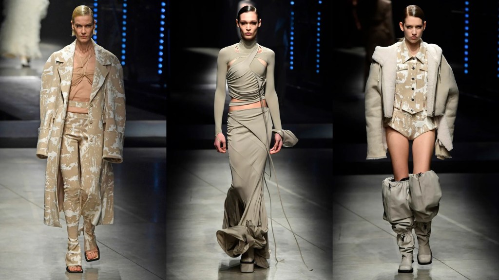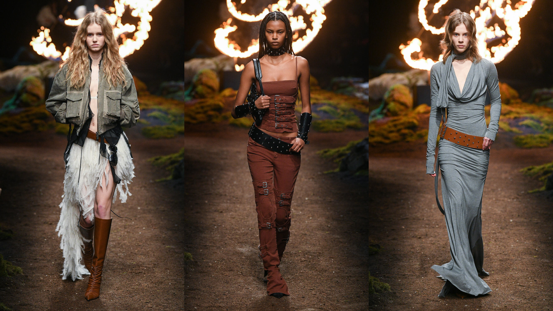 Blumarine sets the Milan Fashion Week catwalk on fire, behind a flamboyant background, to the tune of Michel Gaubert, models parade, like modern Joan of Arc, ready to lead an army in a post-apocalyptic scenario .