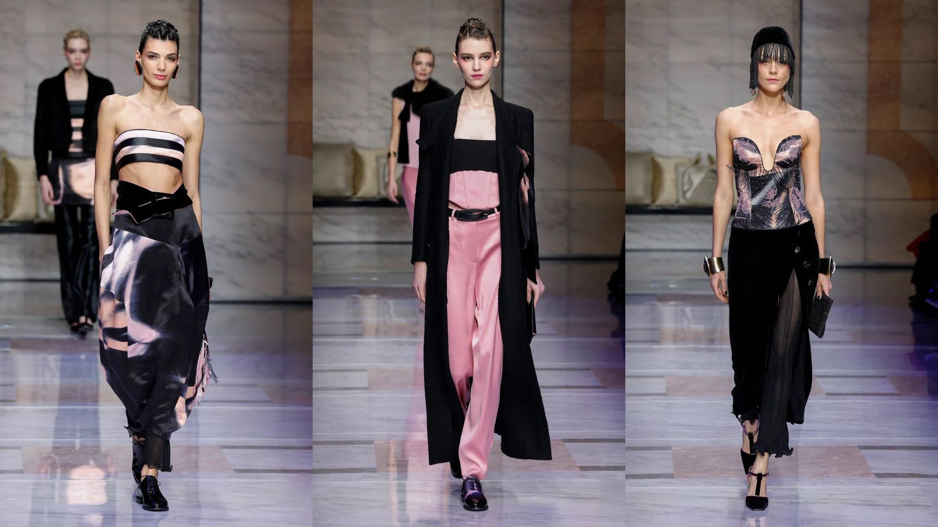 Per l’Autunno-Inverno 2023/2024 Giorgio Armani presenta la sua collezione Cipria, che va in scena nel piccolo teatro di via Borgonuovo 21. Per l’occasione allestito come un palazzo di marmo, dove le modelle chiacchierano tra loro sedute come in un salotto, per poi dare il via a un defilé intimo e concettuale. Pantaloni in satin, maxi dress di seta lucente, tute stampe ton sur ton di un fiore stilizzato.