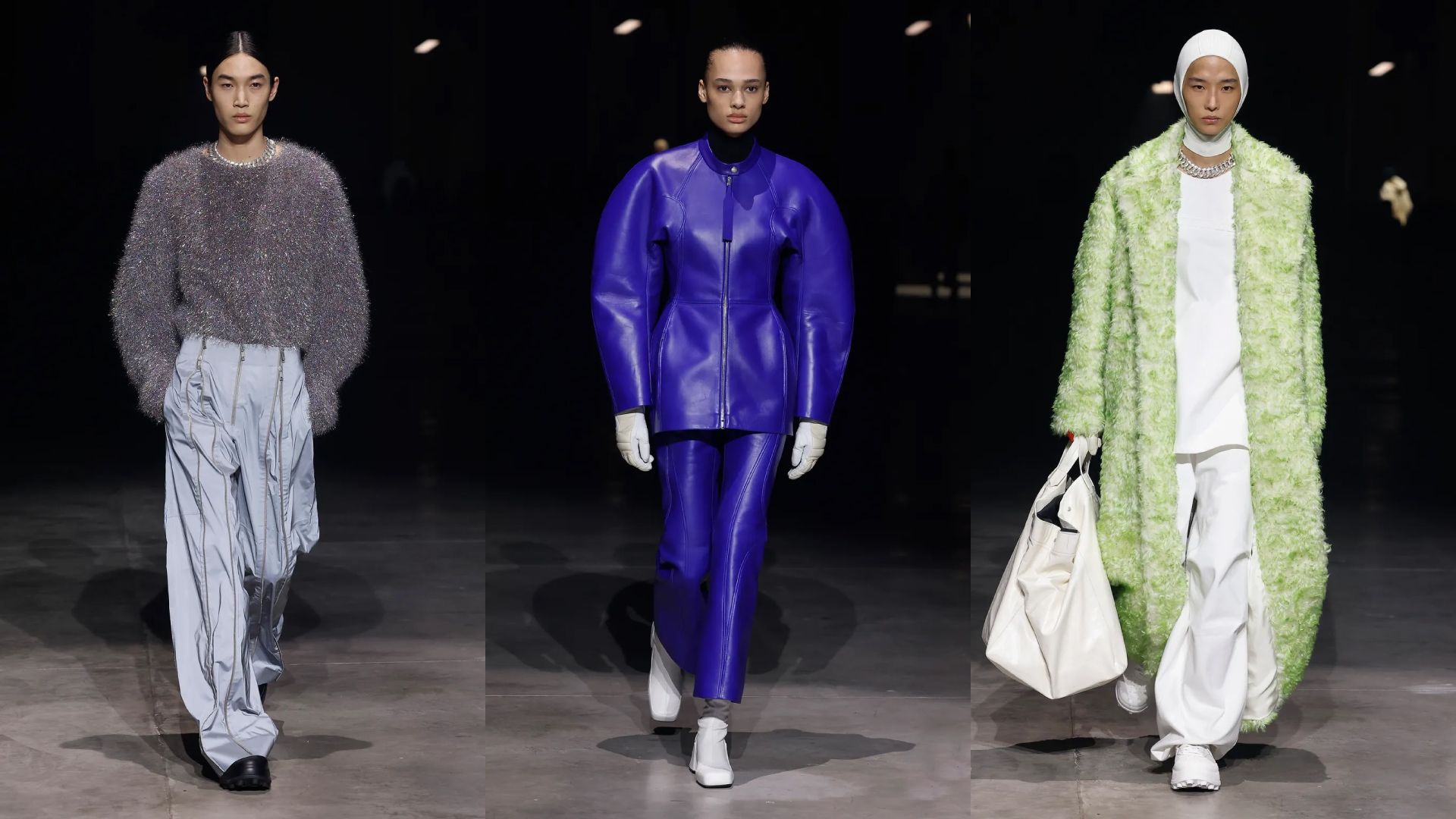 The soundrtrack of Jil Sander‘s fashion show, All Neon Like by Bjork, takes us away from the minimalist codes of the maison we are at get used to it. Wide and rounded shoulders, puffy sleeves, very narrow waist and widening hips.