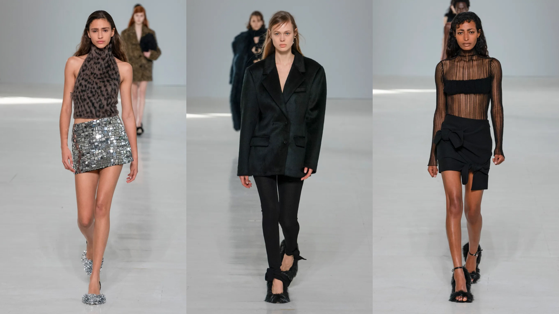 A B of fire welcomes guests to the Blumarine world of Nicola Brognano for Autumn-Winter 2023/2024; Heroines in flowing and transparent, iridescent dresses, accessorized with fringes, collars, belts and pointed socks and boots.