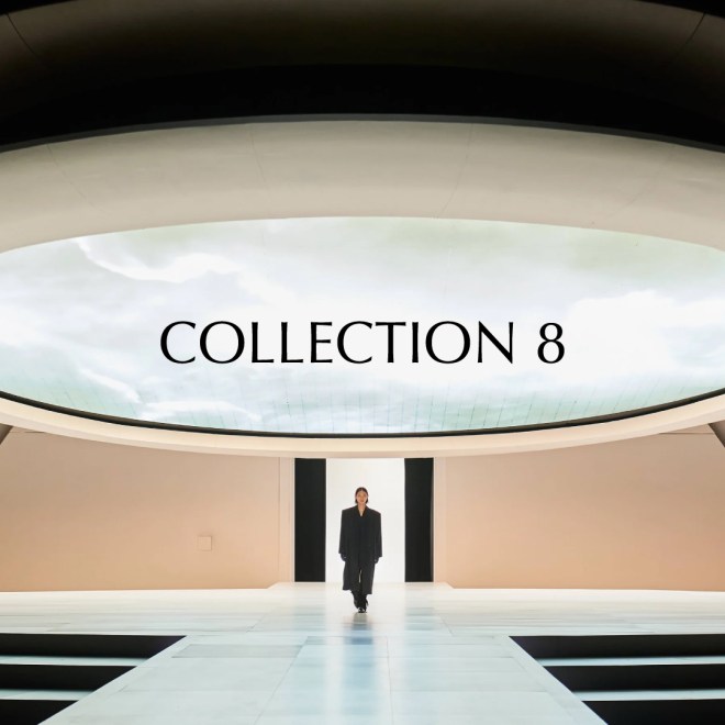 Lorenzo opened the Collection 8 show, with a series of total-black looks, baggy pants, jackets and coats with structured shoulders and wraparound leather belts.