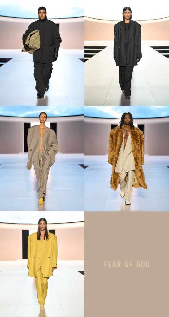 Bianco latte, caramello, giallo burro e grigio antracite sono stati gli altri protagonisti della palette cromatica Fear of God, accuratamente scelti per impreziosire soprabiti in pelle liscia, bomber in shearling e addirittura pantaloncini da basket di lana oversize indossati sopra pantaloni sartoriali dal taglio lungo.