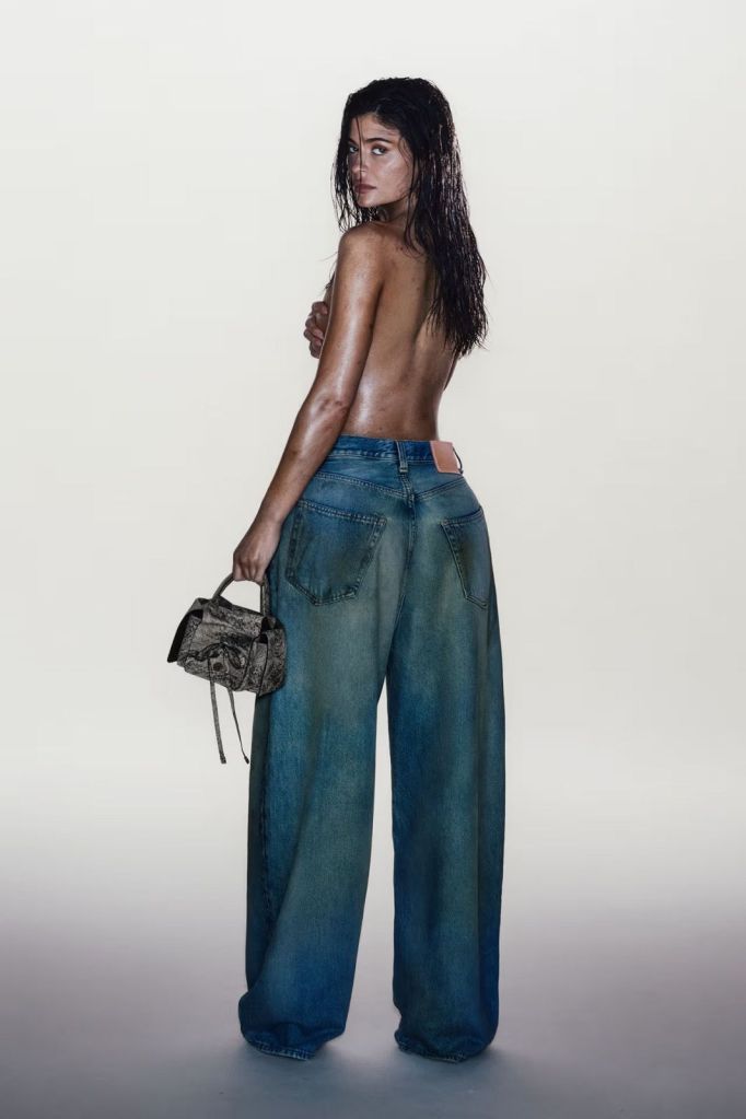 Kylie Jenner wears the unisex 2023 denim model, ultra oversized and available in both the vintage-toned Penicillin wash and the waxed oil-coated wash. The other style worn in the denim campaign is the ‘2021’, a loose-fit, mid-rise, wide-leg jean first introduced in the 2021 collection and featured in the same worn-look washes, as well as the maxi dress Dacna denim and the new Multi-Pocket bag in worn leather and the iconic sunglasses of the season.