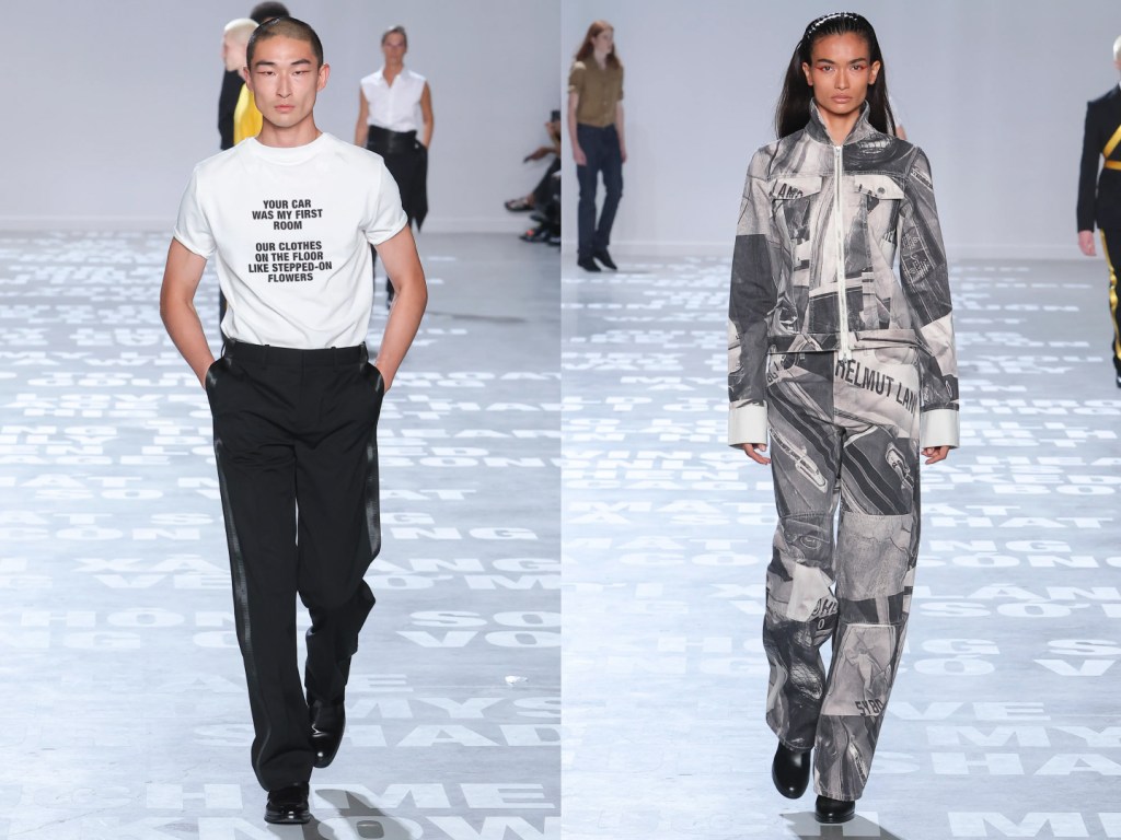 Peter Do, nominato a maggio alla direzione creativa di Helmut Lang, propone uno stile semplice ma allo stesso tempo deciso:fascette di colori flash, come cinture di sicurezza, su completi neri, t-shirt e camicie stampate con slogan del poeta vietnamita Ocean Vuong, in un rimando all’iconica collaborazione di Lang con Jenny Holzer.