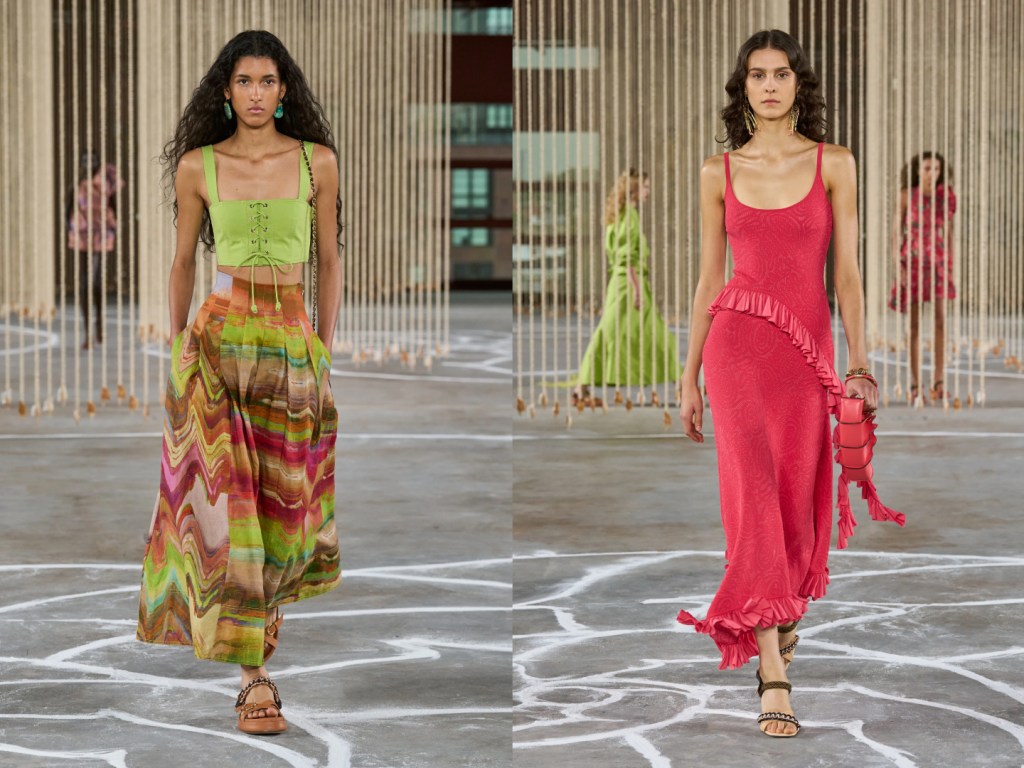 A world of colors and spam, almost as if to break the minimalism of New York, the paintings of Sara Hughes printed on dresses, day suits and outerwear for Ulla Johnson . a feminine collection full of lace-edged satin slips, crochet sets, see-through shirts adorned with ruffles and crochet tops invaded by colored micro sequins.