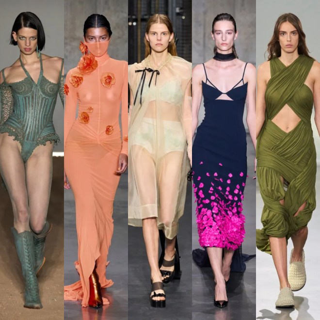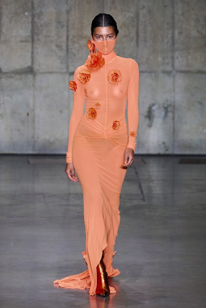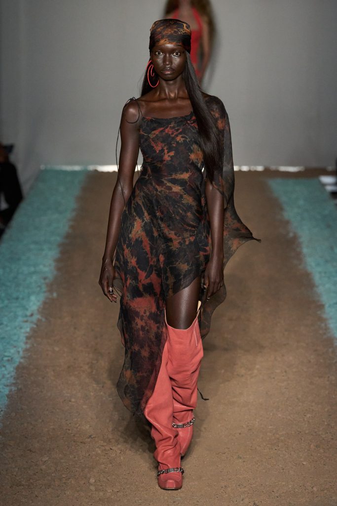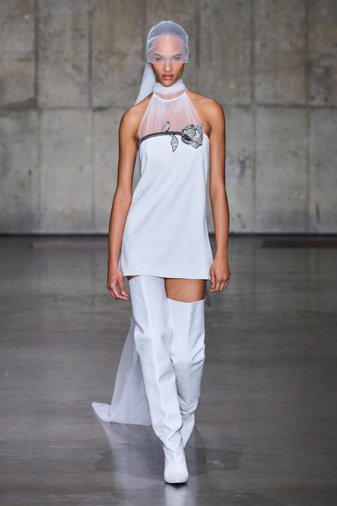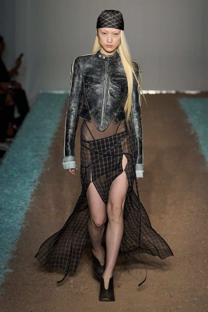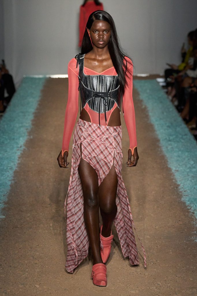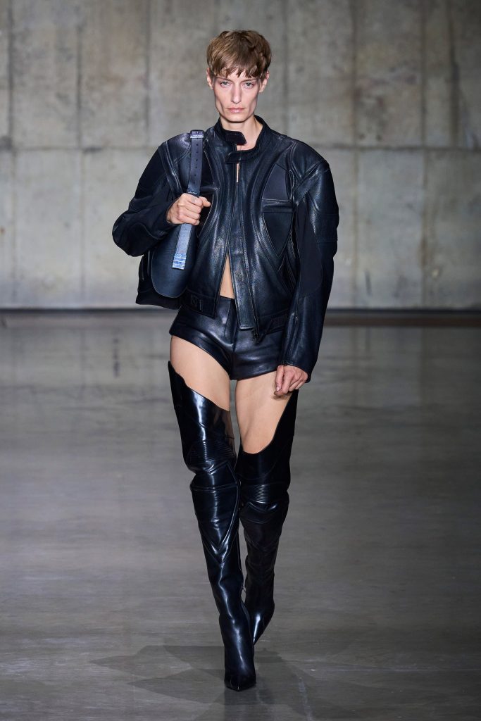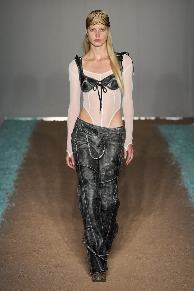 KNWLS, invece, omaggia i centauri harleysti con i loro chopper e i riferimenti metal e hard rock. Pelle, bandane, stivali cuissards e stringhe, con richiami al country. Una femminilità pericolosa e sensuale, per la presenza della lingerie e della corsetteria, segno distintivo della designer Charlotte Knowles, tra body in lycra sgambatissimi e top guêpière fascianti. Chiude la sfilata Mia Khalifa, Tik Tok star, ex attrice pornografica, ora figura mediatica, impegnata anche per sostenere diverse cause sociali e politiche.