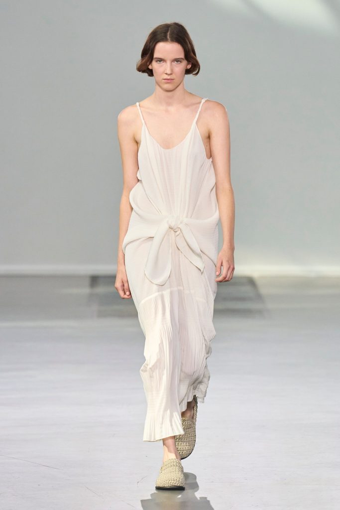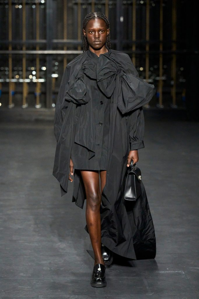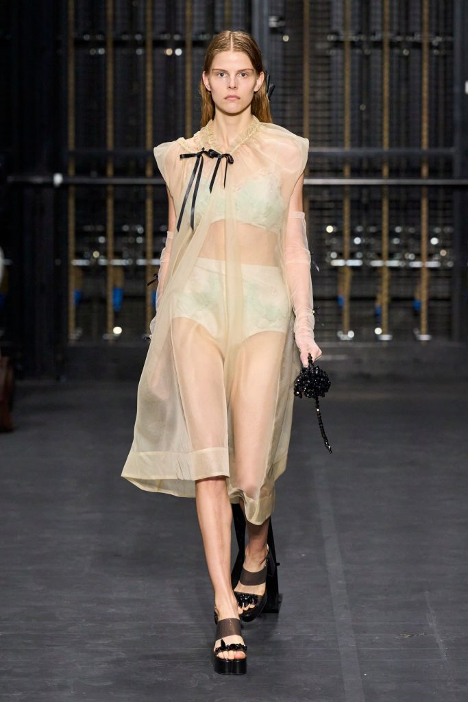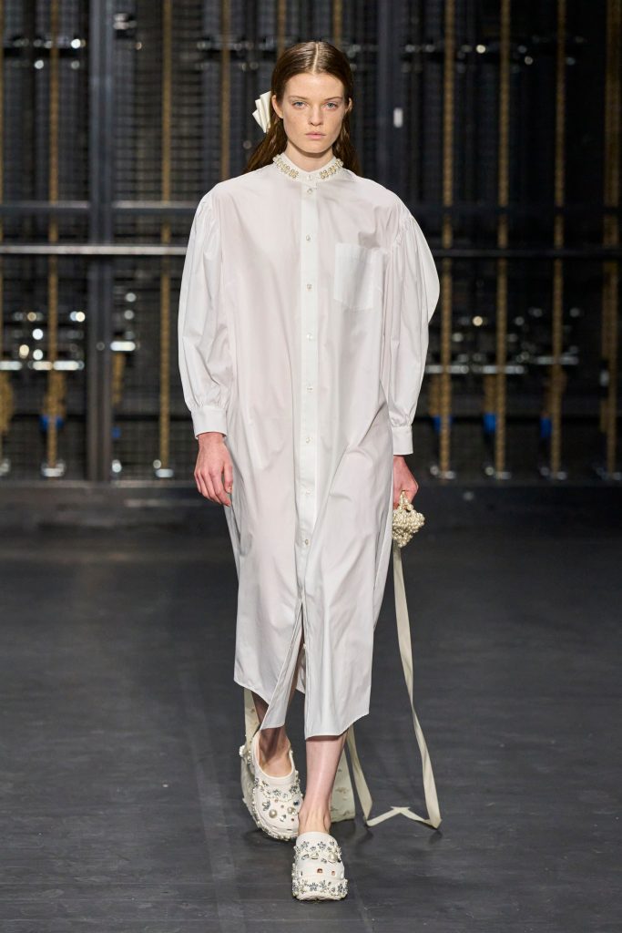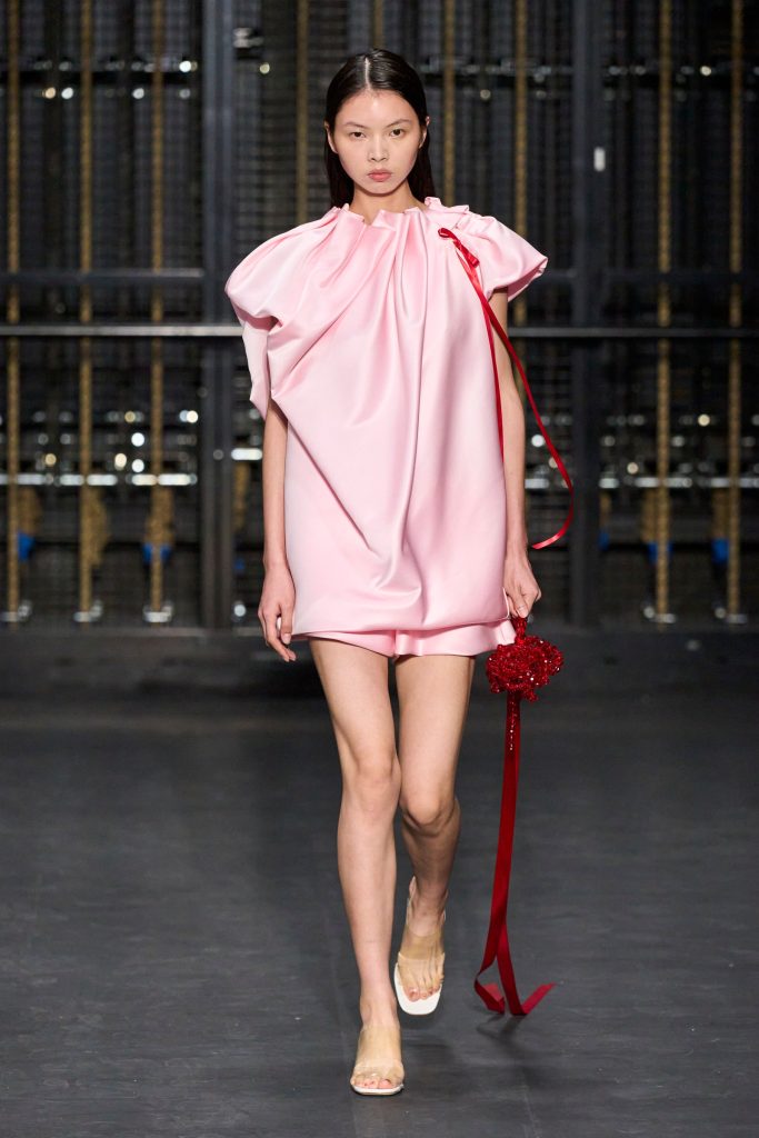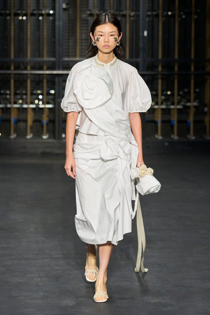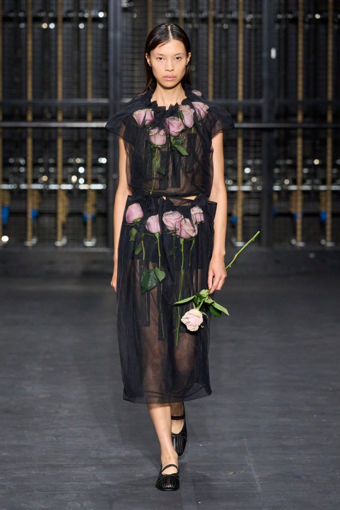 From contemporary minimalism to precious applications, feminine, elegant, but also romantic garments with references to the past. Roses, flowers are recurring elements in various collections, such as that of Simone Rocha. The show, entitled“Dress Rehearsal”was presented in the rehearsal room of the English National Ballet, the designer transforms the flowers into textile swirls that wrap around the body, all embellished with pearls and macramé, bows.