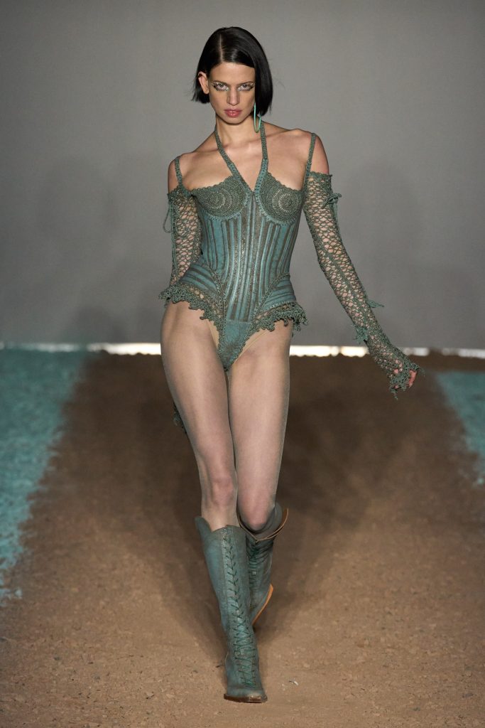 KNWLS, on the other hand, pays homage to the Harley riders with their choppers and metal and hard rock references. Leather, bandanas, cuissard boots and laces, with country references. A dangerous and sensual femininity, due to the presence of lingerie and corsetry, a distinctive sign of the designer Charlotte Knowles, between high-cut lycra bodysuits and figure-hugging guêpière tops. Closing the show was Mia Khalifa, Tik Tok star, former pornographic actress, now media figure, also committed to supporting various social and political causes.