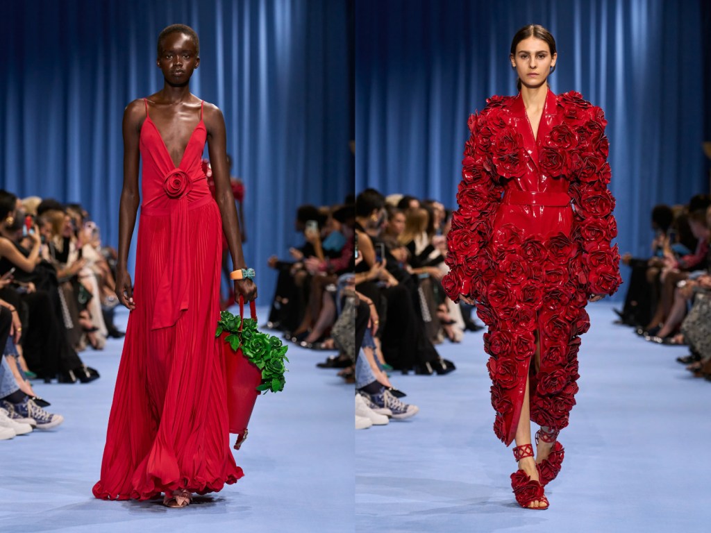 A floral explosion on the catwalk at Balmain, hundreds of 3D roses punctuate the looks of the collection, decorate the bags accompanying its jackets with narrow silhouettes, bloom on coats and on draped mini dresses. Two-tone prints and precious embroideries, birds and paradisiacal fantasies to fly with your thoughts in a light and deliberately carefree way.