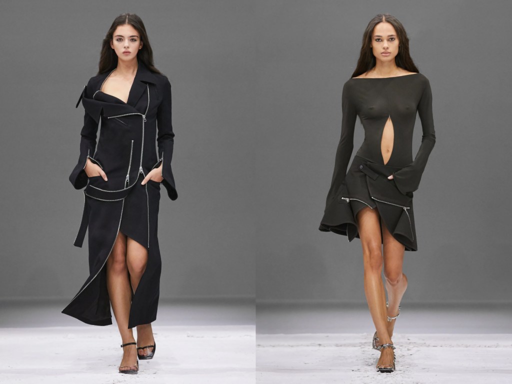 Bomber, slip dress in maglia, abiti con spalle-armatura che nascondono una fodera di rouches a contrasto.
