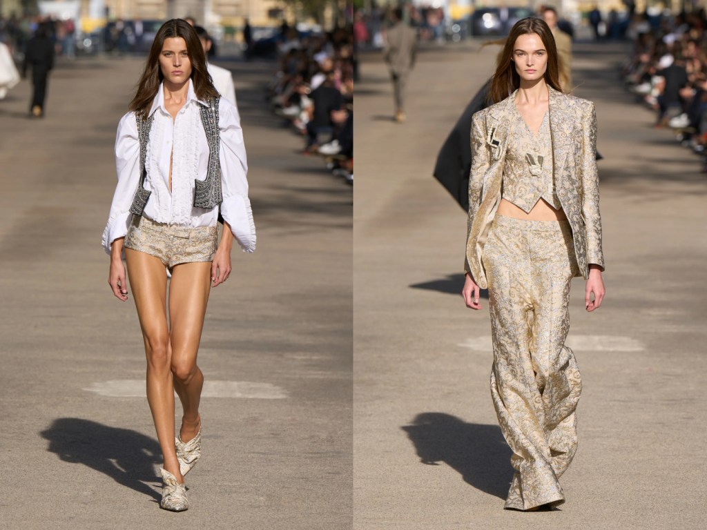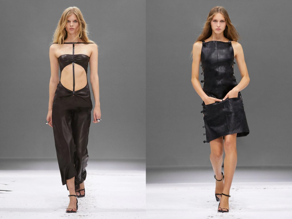 Su una catwalk rivestito di gesso, richiamo al suolo lunare, è andata in scena la collezione primavera estate 2024 di Courrèges, capi destrutturati, camicie e vestiti cut out, giacche in pelle con zip metalliche, pantaloni destroyed. Tra le top model, ad attirare l’attenzione su di se, la giovane modella Deva Cassel, figlia di Monica Bellucci e Vincet Cassel, che ha sfoggiato un capospalla nero dalla linea asimmetrica.