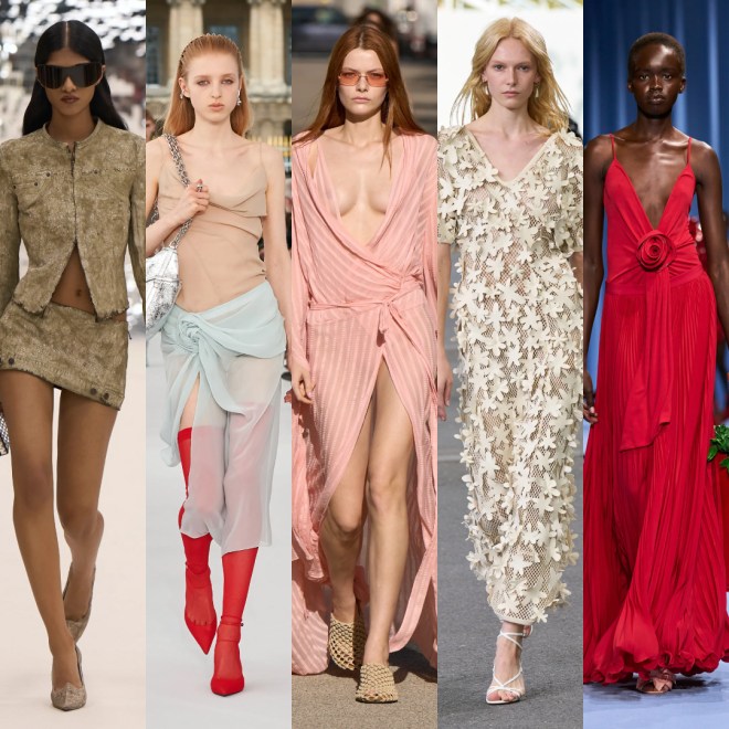 Tanto colore, compreso il rosso fuoco, anche da Givenchy, tagli sartoriali, maxi blazer maschili che si mixano a tessuti leggeri e impalpabili, trasparenze e stampe floreali. Protagonisti in questa collezione sono i collant e i gambaletti, indossati sulle decolleté con il tacco.