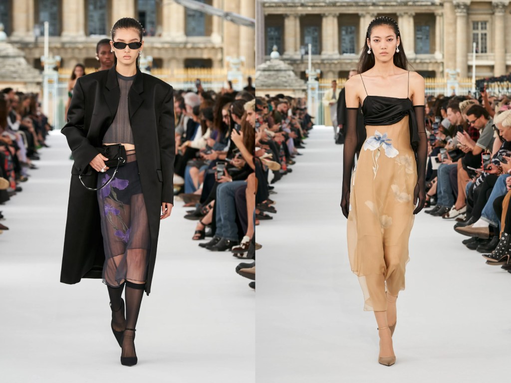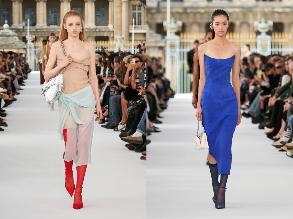 Lots of colour, including fiery red, also from Givenchy, tailored cuts, maxi blazers for men mixed with light and impalpable fabrics, transparencies and floral prints. The protagonists of this collection are tights and knee-highs, worn over heeled pumps.