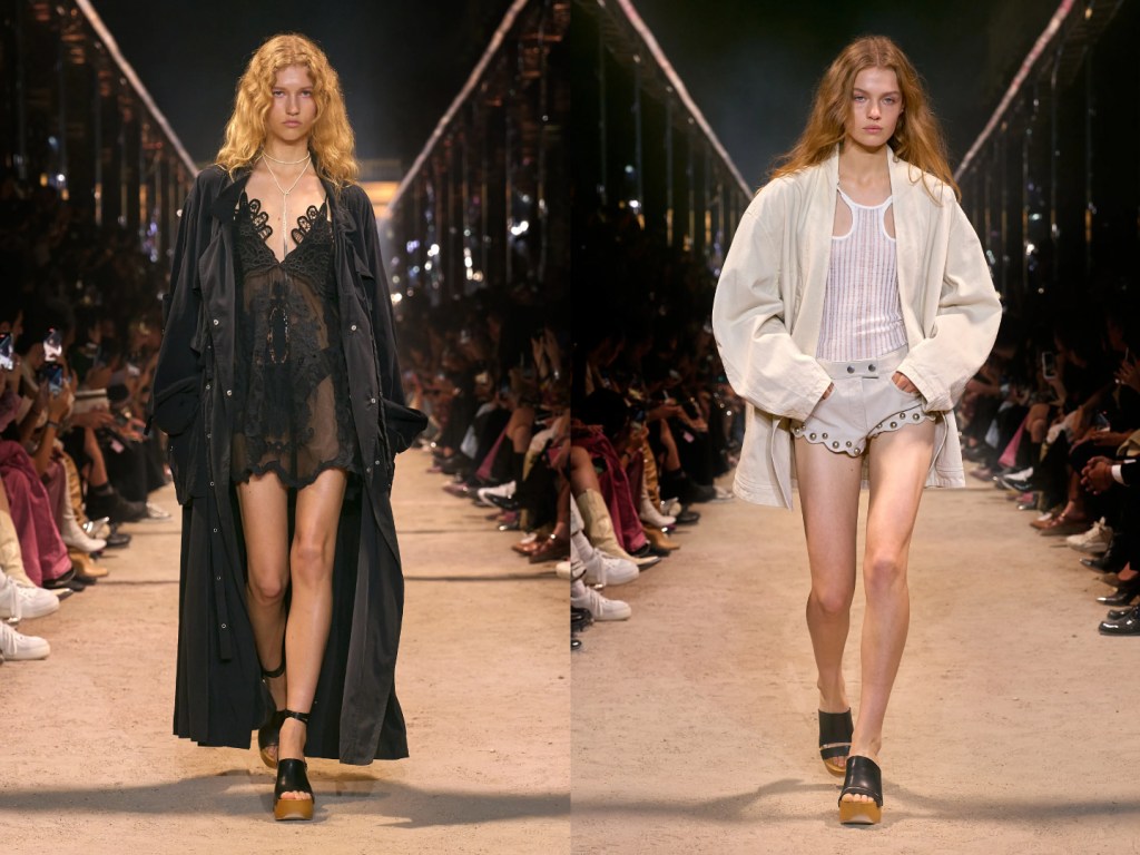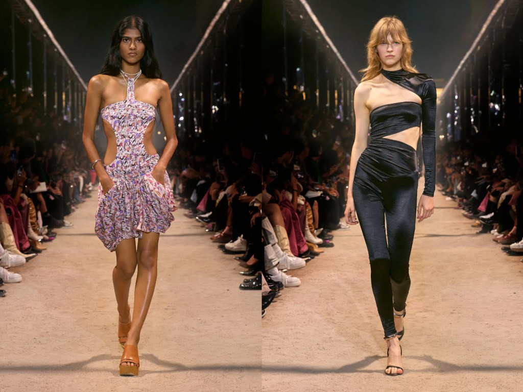 The SS24 collection by Isabel Marant is sensual and feminine: silk T-shirts, micro tops and mini dresses that hug the body, leggings and super-stretch jumpsuits on clogs with Seventies style rafts.
