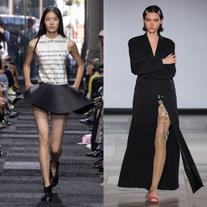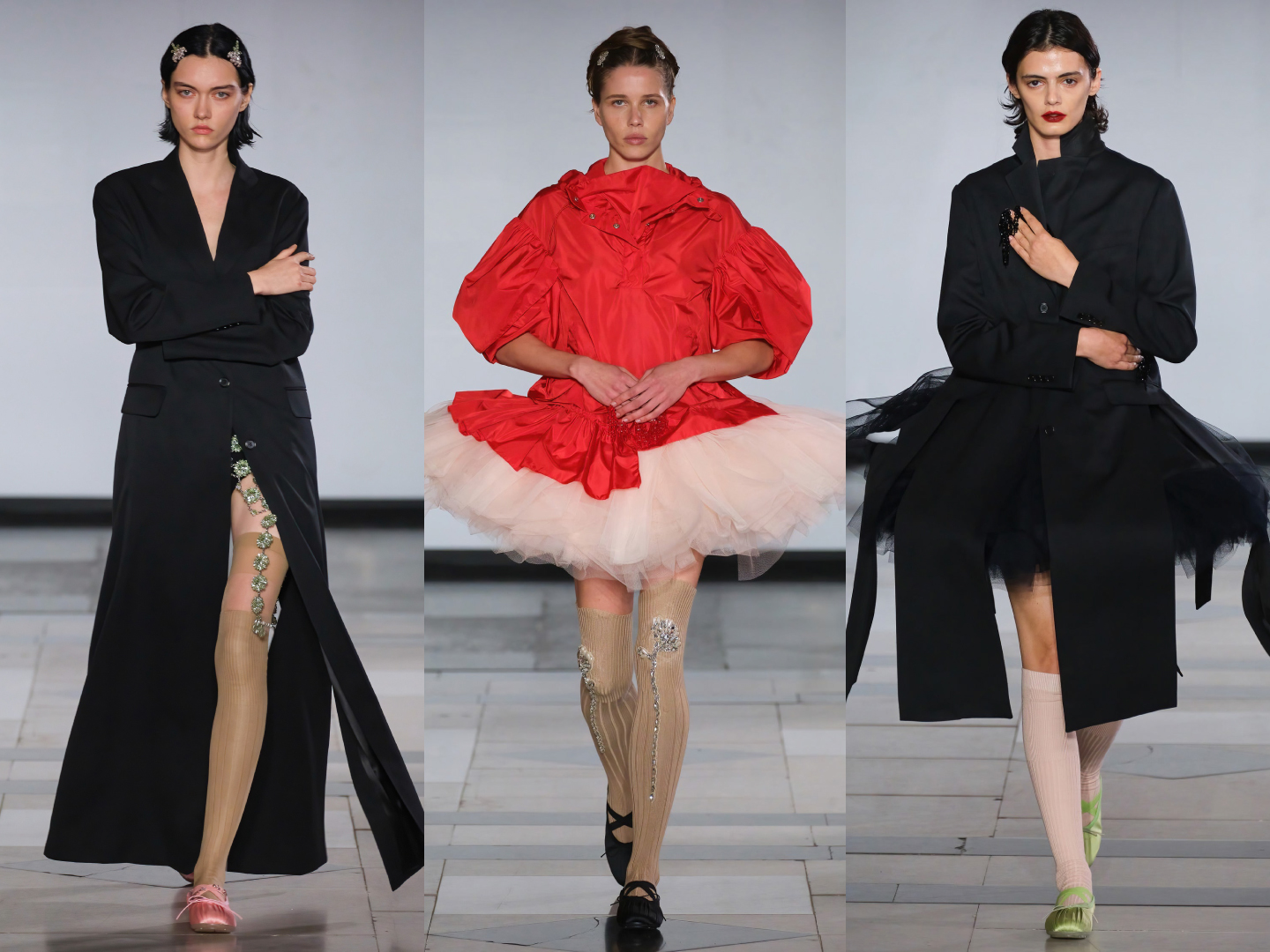 Simone Rocha ha presentato una collezione dal titolo “Dress Rehearsal”, dove eleganti abiti in seta e taffetà, decorati con nastri e fiori scolpiti, si sono distinti per un approccio minimalista, in contrasto con la sua consueta grandeur.