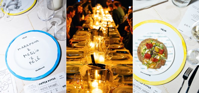 Dopo un aperitivo in boutique, gli invitati si sono spostati con un bus transfer dedicato verso una location segreta, dove li attendeva una cena privata in un’ambientazione suggestiva: un campo da calcio con vista sul Vesuvio, in perfetta sintonia con il tema calcistico della sneakers. L’atmosfera era curata nei minimi dettagli, dalle proiezioni alle luci, fino alla mise en place pensata da Giotto Calendoli, che ha trasformato la tavola in un tributo al gioco più amato al mondo: una tovaglia lunga 16 metri cucita a mano dalla madre di Giotto per riprodurre le cuciture di un pallone, sottopiatti dipinti a mano con illustrazioni ispirate al calcio e un menu ideato come un biglietto dello stadio.