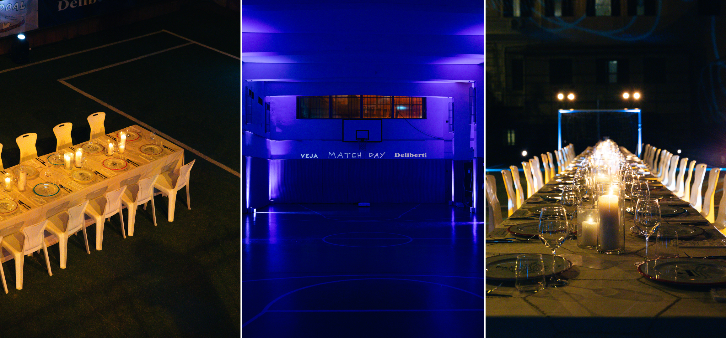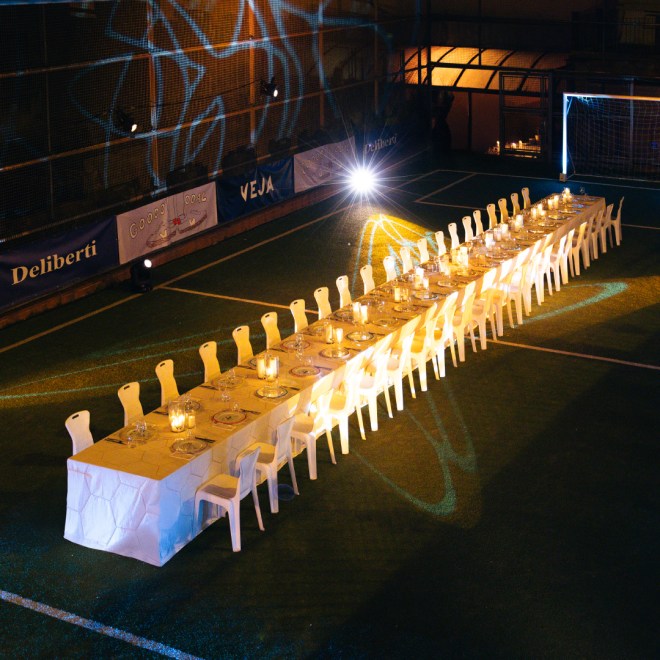After an aperitif at the boutique, guests were taken via a dedicated bus transfer to a secret location, where a private dinner awaited in a truly evocative setting — a football pitch overlooking Mount Vesuvius, perfectly in tune with the sneaker’s football-inspired theme. The atmosphere was crafted down to the finest detail, from the lighting and projections to the table setting designed by Giotto Calendoli, who transformed the dinner table into a tribute to the world’s most beloved sport: a 16-meter hand-sewn tablecloth made by Giotto’s mother to recreate the stitching of a football, hand-painted chargers featuring football-inspired illustrations, and a menu designed like a stadium ticket.